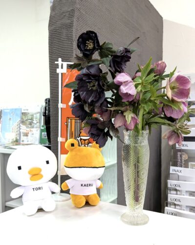 さっそく会社に持ち帰り、花瓶に生けて受付へ。マド本舗の看板キャラクター「とりかえる君」の周りにが一気に華やかに✨✨
