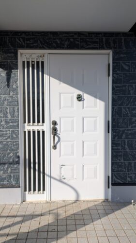 既存は白色の玄関ドアでしたが、今回は木目調の玄関ドアへ取替しました。