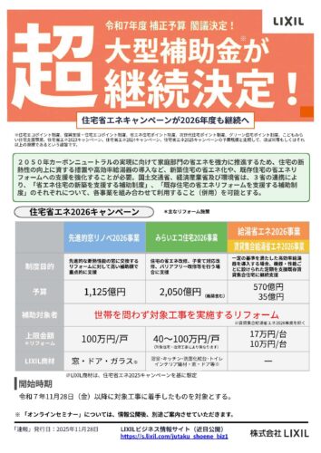 令和7年度補正予算が閣議決定され、「住宅省エネ2026キャンペーン」が来年度も実施されることが正式に発表されました。